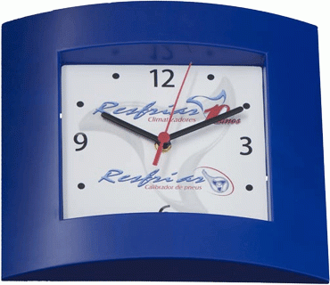 Relógio de parede Retangular com 27 cm x 25 cm na posição vertical.