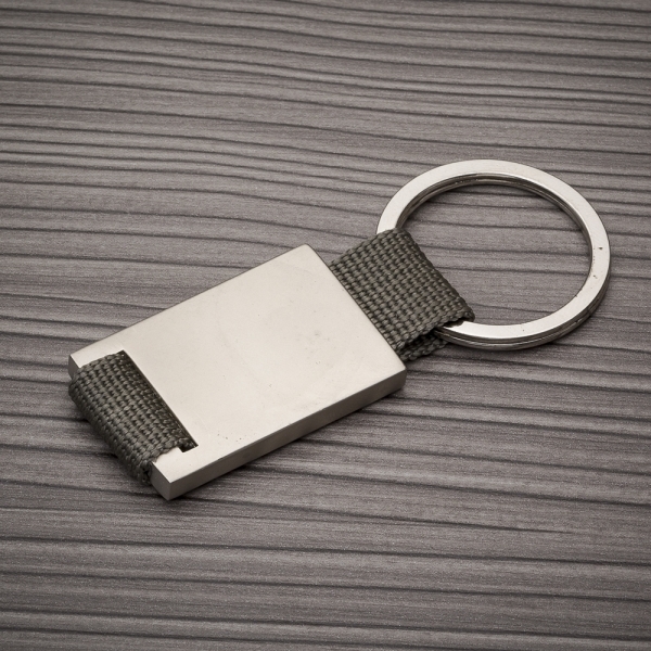 Chaveiro de metal com detalhe colorido em nylon. Metal liso e fosco de ambos lados.